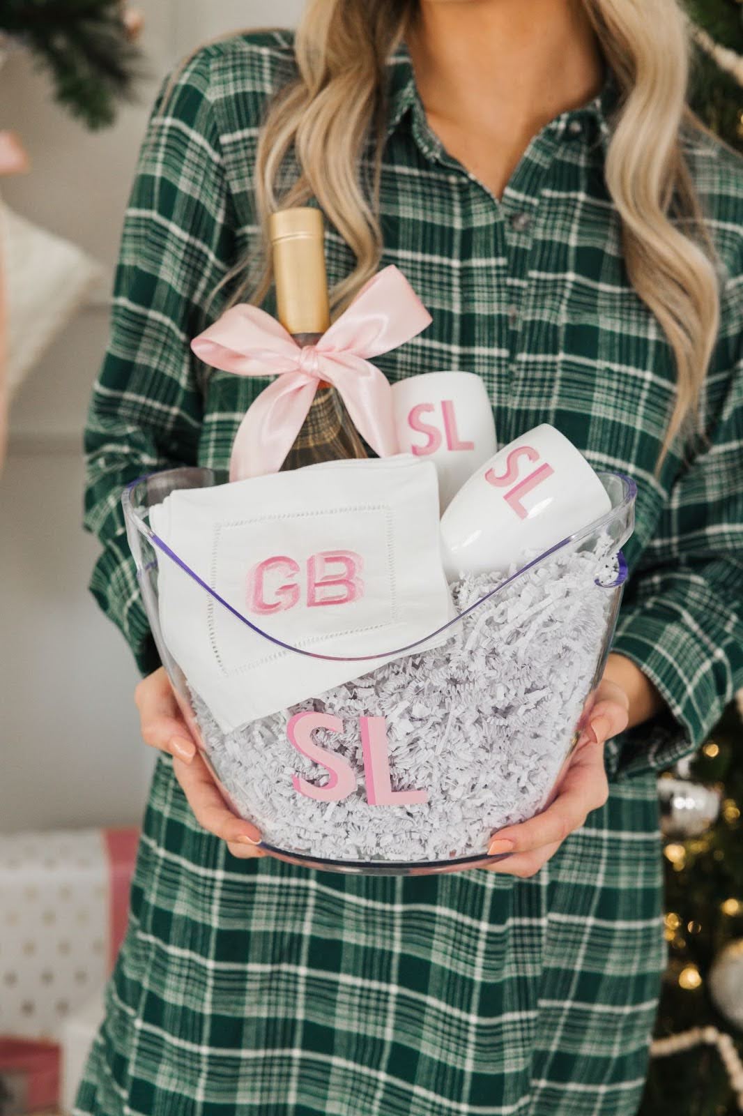 Custom wine glasses, buckets, and festive napkins make the perfect gift to toast your favorite holiday hostess in style.
