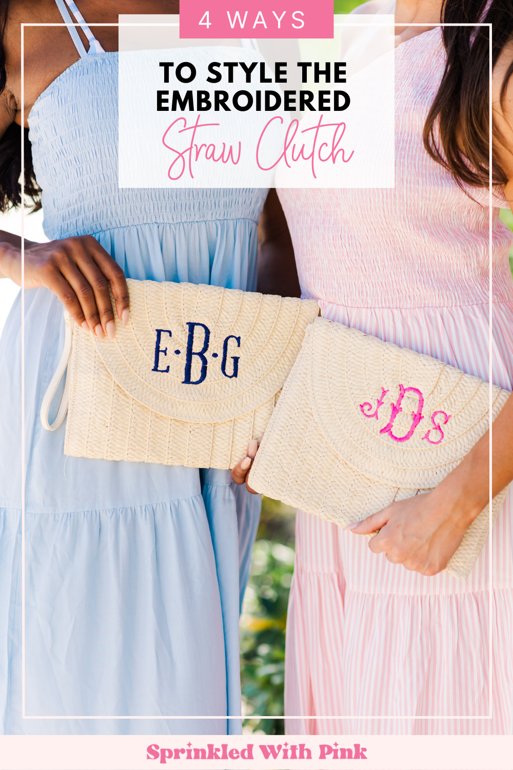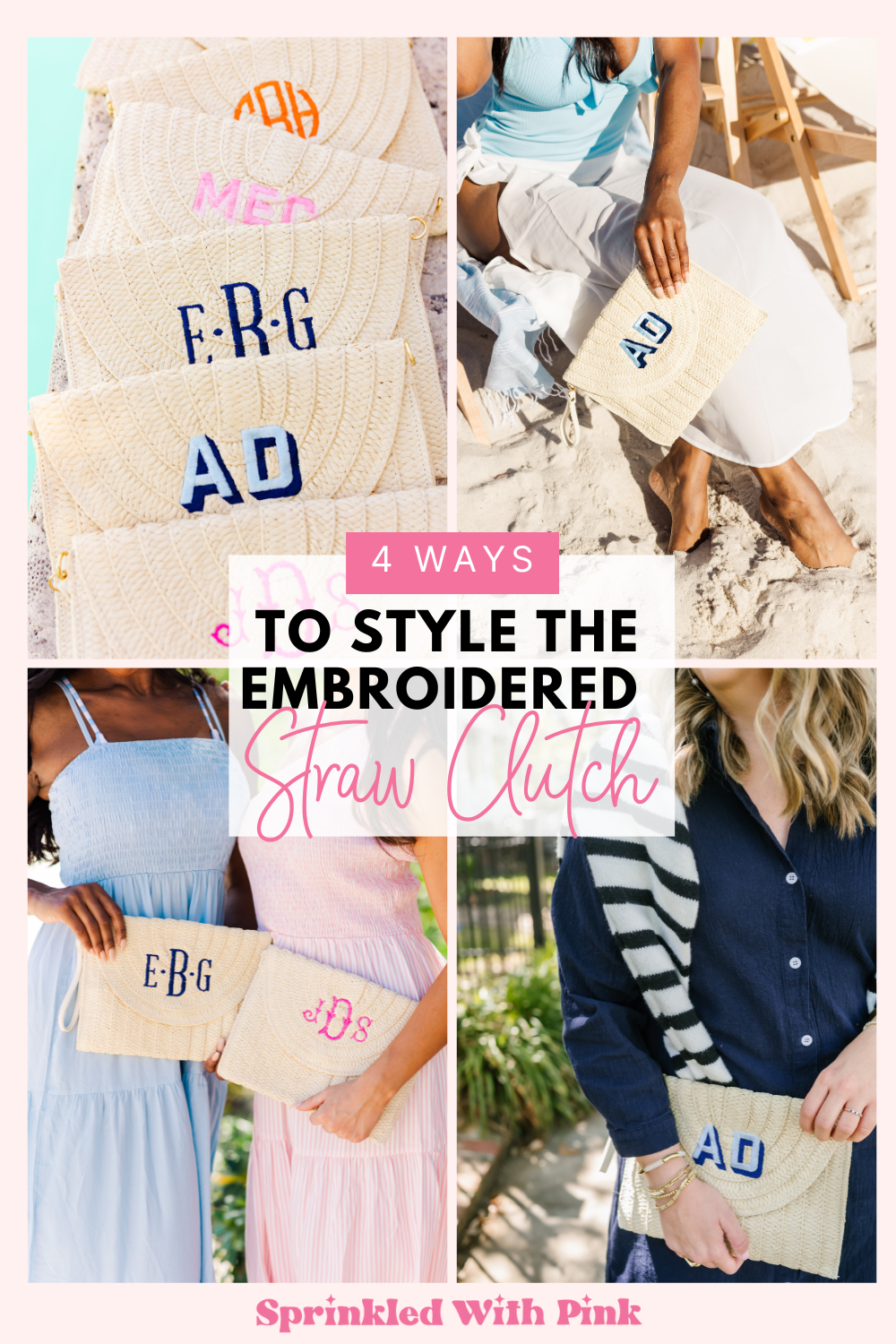 Step up your accessory game this summer! The Embroidered Straw Clutch is the perfect summer accessory! Whether you are going out on the town for the day, headed to the pool or beach, or going to dinner, it is the perfect size to hold everything you need and will match any of your summer outfits! Its compactness makes it an easy accessory to pack for all your vacations. Our Embroidered Straw Clutch adds such a unique spin as the monogram is completely customizable and there are so many color options to choose from! Here are 4 Ways To Style The Embroidered Straw Clutch!