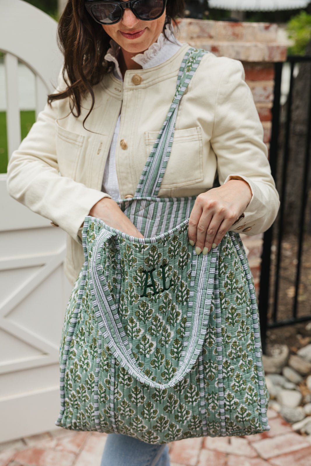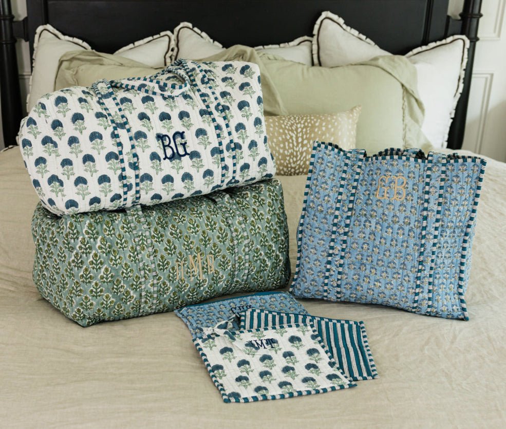 Make fall travel effortless and stylish with our Embroidered Block Print Tote & Pouch Bundle. Hand block printed in signature quilted cotton patterns and personalized with matching embroidered monograms on both pieces, this set is a thoughtful, elevated gift — or a chic way to organize your own essentials.