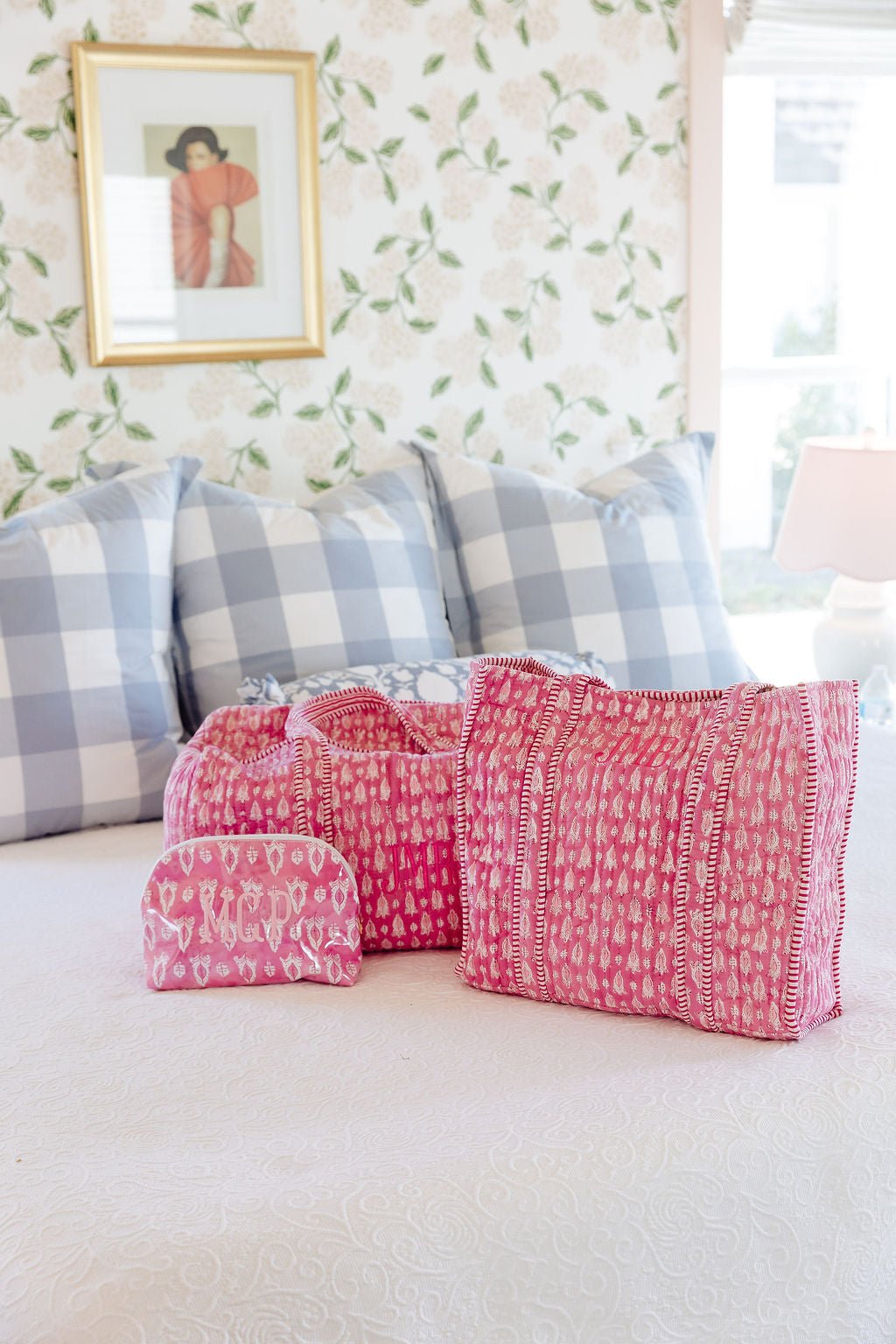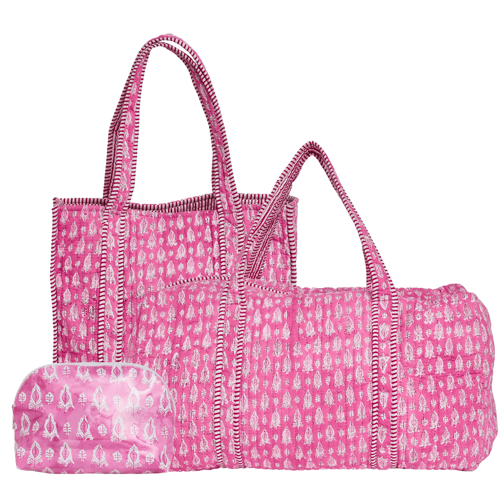 Your go-to set for staying organized, wherever life takes you. The Block Print Essentials bundle includes our bestselling tote, duffel, and a clear coated pouch, all designed in the bold Into the Wild prints, Pink Lotus, Jungle Panther, and Willow. Each piece is personalized with a matching monogram for a cohesive, polished look that feels both practical and special. The tote and duffel are crafted from quilted 100% cotton for lightweight, everyday carry, while the medium pouch features a clear coated exterior that’s durable and wipeable, making it perfect for keeping smaller essentials organized on the go. Whether you’re packing for a weekend trip, heading to work, or managing a full day of errands, this set brings together function, flexibility, and standout style. It also makes a thoughtful, ready-to-gift option for Mother’s Day, teachers, graduates, or travel lovers. Customers love the fully coordinated set, the mix of soft quilted fabric and easy-clean materials, and the bundled savings that make it easy to get all three.