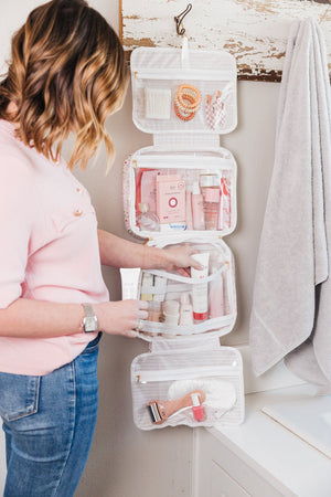 Unfold the makeup bag with compartments to reveal four spacious zipper compartments and elastic loops that hold everything in place from makeup brushes to full-size toiletries. The travel organizer has a durable, wipe-clean finish to ensures it stays fresh and travel-ready, while the hanging design makes it easy to use in hotel bathrooms, gyms, or at home.