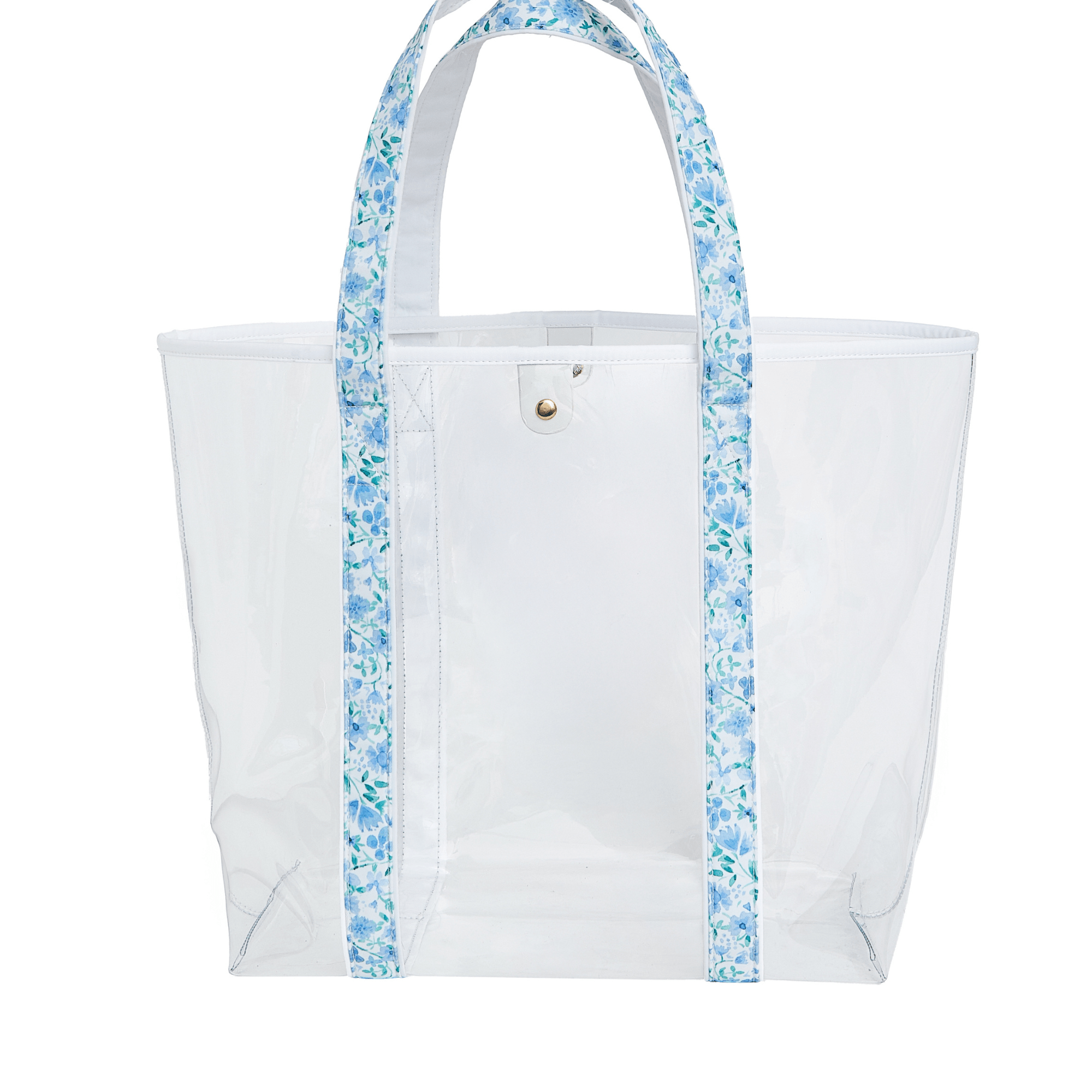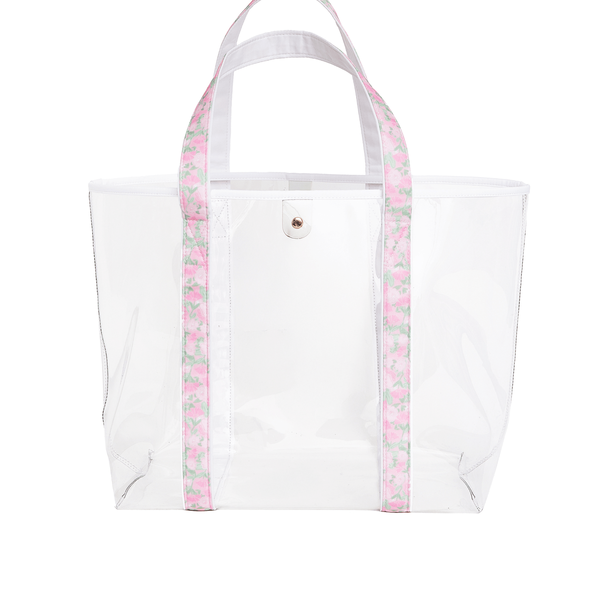 Carry everything in style with our Personalized Clear Tote Bag, designed to be both functional and elevated. Crafted from high-quality, thick clear PVC with a glossy finish, this tote offers a polished look that feels luxe and durable. Featuring patterned straps in our exclusive spring prints and a gold metal magnetic snap closure, it is perfect for pool days, beach trips, travel, and everyday outings. Finished with an applique monogram, this tote adds a personalized touch that makes it feel truly one of a kind.